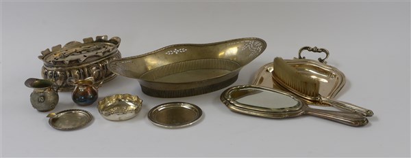 Lotto composto da un centrotavola ovale, una scatola con coperchio, tre piattini, due piccole brocche in argento (gr 780) uniti ad un raccoglibriciole con spazzola ed uno specchio a mano in lamina d'argento (difetti)