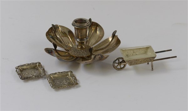 Lotto composto da una bugia, un toy a forma di carriola e due piccoli posacenere in argento (gr 290)