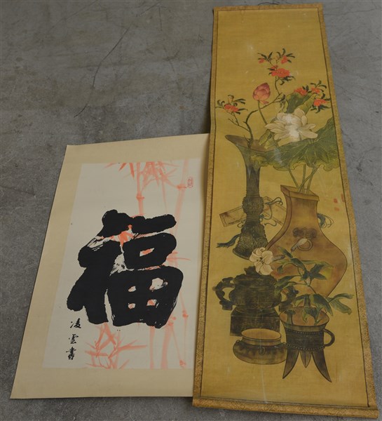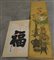 Una stampa e un dipinto orientale con motivi floreali e calligrafia
