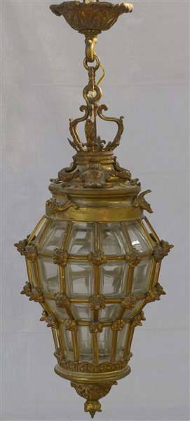 Lanterna con struttura in bronzo dorato e cesellato a motivi vegetali e vetro, fine sec. XIX (h cm 75) (difetti)