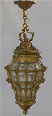 Lanterna con struttura in bronzo dorato e cesellato a motivi vegetali e vetro,
