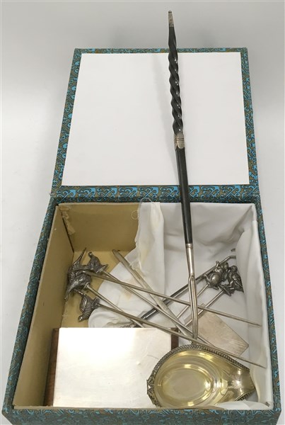 Scatola contenente alcuni spilloni d'arrosto, un mestolo ed altri oggetti diversi in argento