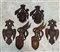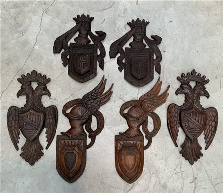 Lotto di tre coppie di elementi decorativi in legno scolpito con stemmi (h max