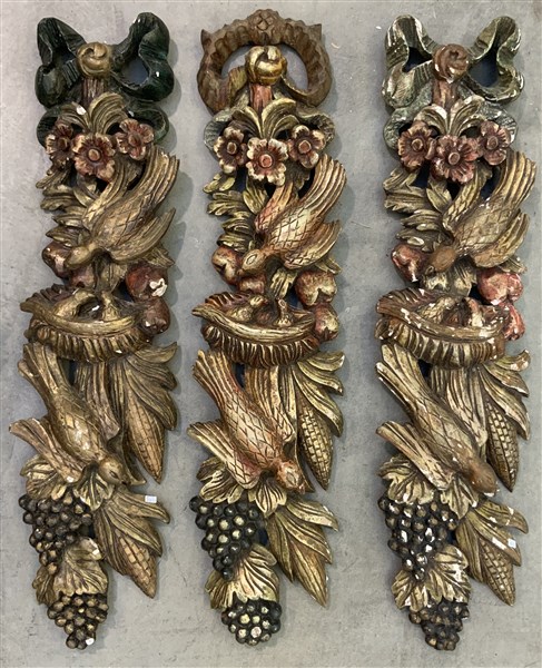 Lotto di tre elementi decorativi a soggetto naturalistico in legno scolpito e d