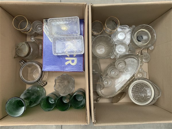 Lotto di due cartoni contenenti numerosi oggetti in vetro per la tavola (difett