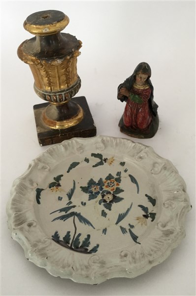 Lotto composto da un piatto in maiolica del secolo XVIII, una scultura lignea r