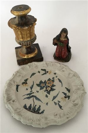 Lotto composto da un piatto in maiolica del secolo XVIII, una scultura lignea raffigurante Madonna ed una base in legno scolpito e dorato raffigurante vaso (difetti)