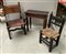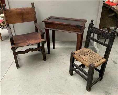 Lotto composto da un tavolino con piano sollevabile e due sedie con sedute in paglia e cuoio (difetti)