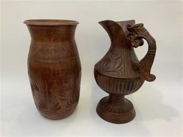 Lotto composto da un portaombrelli e una brocca decorativa, terracotta modellata e incisa (h cm 45) (difetti)