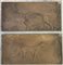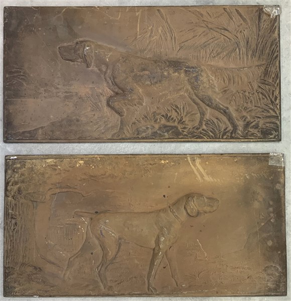 Coppia di piastre in ferro con bassorilievi raffiguranti cani da caccia (cm 70x35) (difetti)
