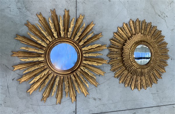 Lotto di due specchiere con cornici in legno dorato a raggi di sole (d max cm 82) (difetti)