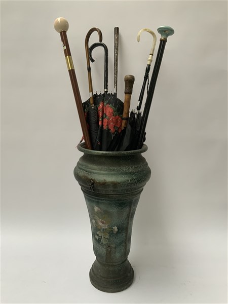 Lotto composto da un portaombrelli in metallo dipinto contenente tre ombrelli per signora e quattro bastoni da passeggio di cui uno con presa in argento (difetti)