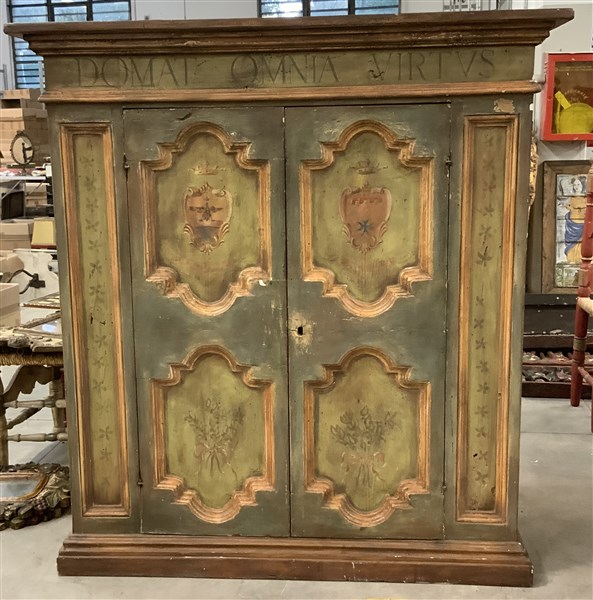 Mobile in legno dipinto a due sportelli riquadrati e decorati da fiori e stemmi