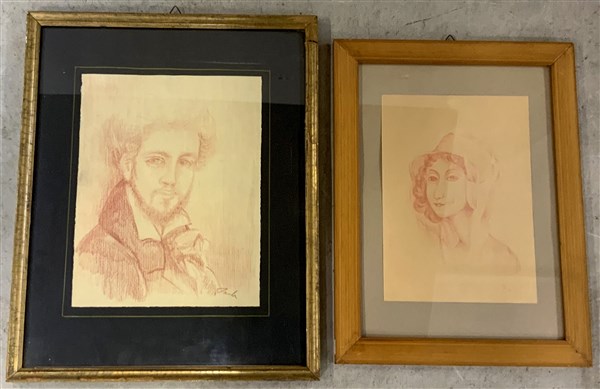 Lotto di due sanguigne raffiguranti un ritratto maschile ed uno femminile, firmate in basso a destra, misure differenti, in cornici (lievi difetti)
