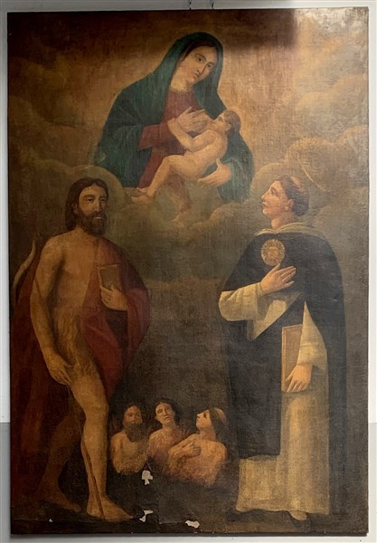 Ignoto "Madonna con Bambino fra i santi Giovanni e Bernardino" antico dipinto ad olio su tela (cm 160x110) (difetti e restauri)