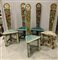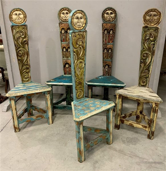 Lotto 1789 | Gruppo di cinque sedie a tre gambe in legno dipinto con schienali intagliati e