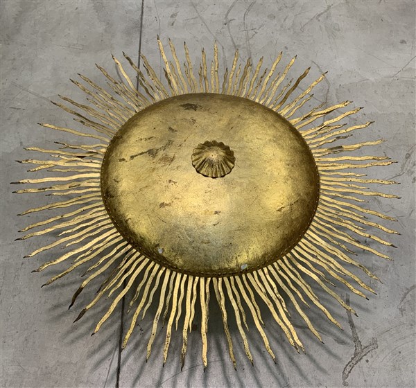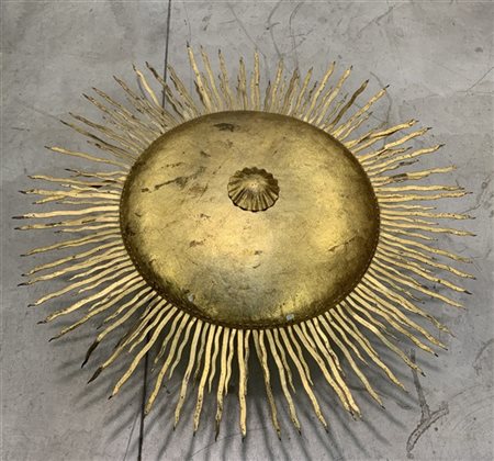 Lampadario a tre luci con paralume in metallo dorato a foma di raggi di sole (difetti)