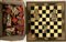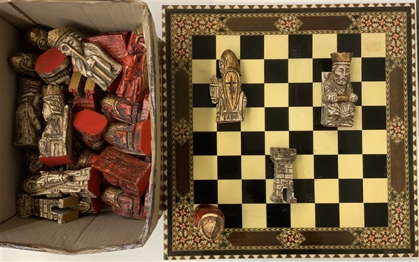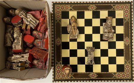 Lotto composto da una scacchiera con scacchi non pertinenti in legno scolpito e