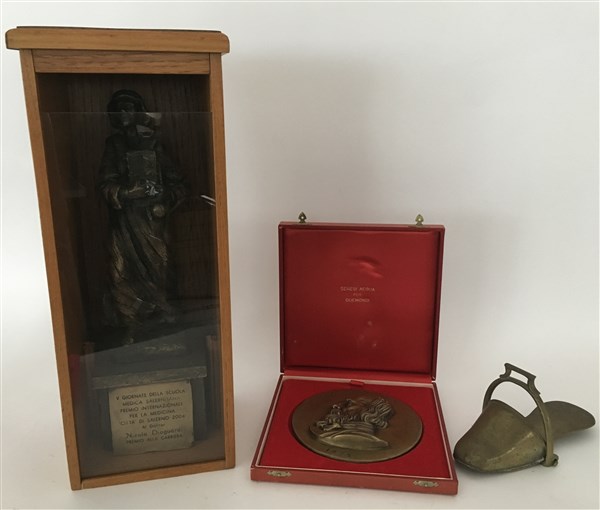 Lotto composto da una scultura raffigurante uno zoccolo, una medaglia raffigurante Garibaldi ed un premio alla carriera in bronzo (difetti)