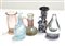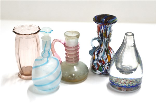 Manifattura di Murano del sec. XX, lotto composto da una bottiglia a collo stretto, tre vasetti ed una bottiglia con tappo di decori diversi (difetti)