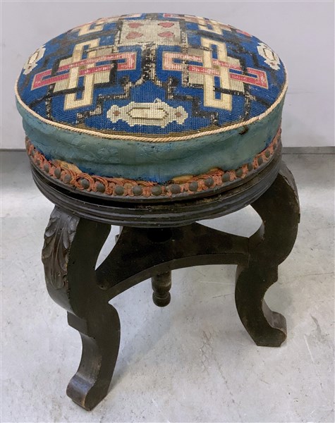 Sgabello per pianoforte in legno ebanizzato con seduta regolabile rivestita con tessuto operato, secolo XIX (difetti)