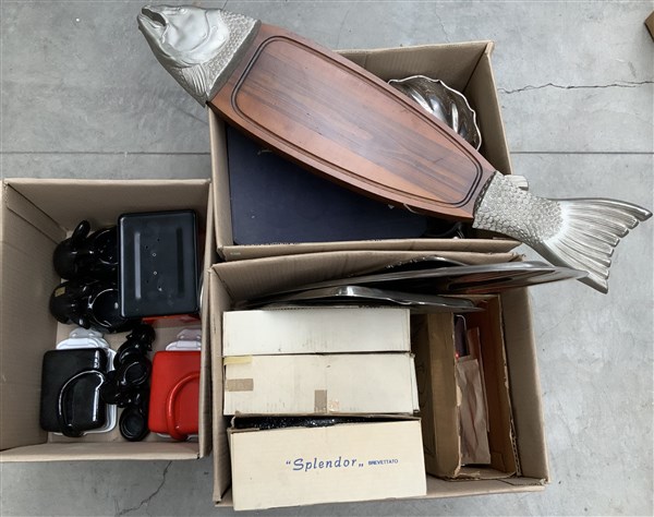 Lotto di tre cartoni contenenti pentole e oggetti vari per la tavola (difetti)