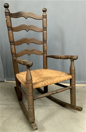 Sedia a dondolo con montanti in legno tornito, schienale a giorno e seduta in paglia (difetti)