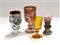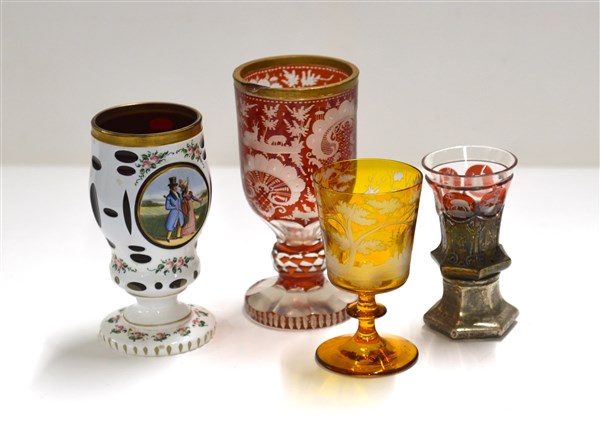 Manifattura di Boemia, secolo XIX, lotto composto da quattro bicchieri in cristallo molato di cui uno smaltato bianco e decorato in policromia ed uno con gambo in argento cesellato (h max cm 20) (difetti)