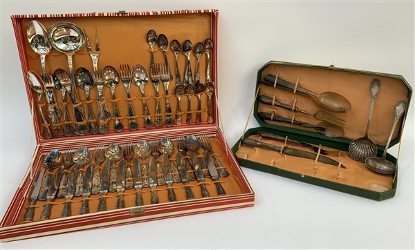 Lotto composto da una parte di servizio di posate in metallo argentato e alcune posate da portata con manici in lamina d'argento, in custodie (difetti)