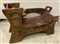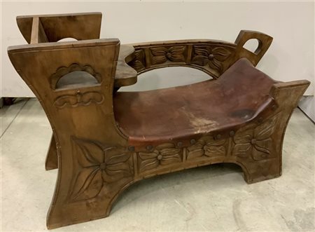 Panchetta in legno intagliato a motivi floreali con seduta in cuoio e piccolo piano d'appoggio (cm 109x66x37) (difetti)