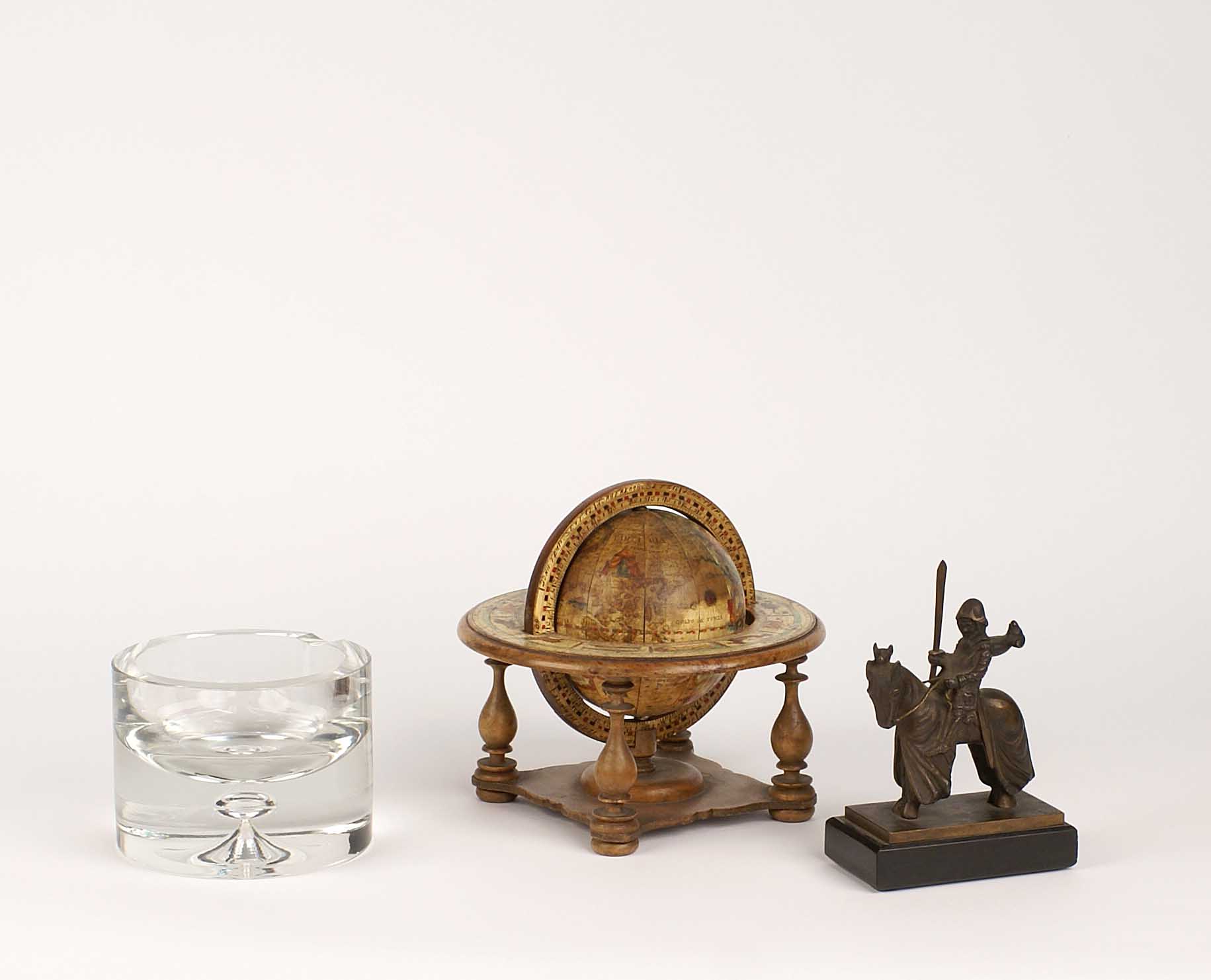 LOTTO DI TRE OGGETTI manifatture diverse Composto da un piccolo globo in legno, una scultura in bronzo patinato su base in marmo e un posacenere in cristallo