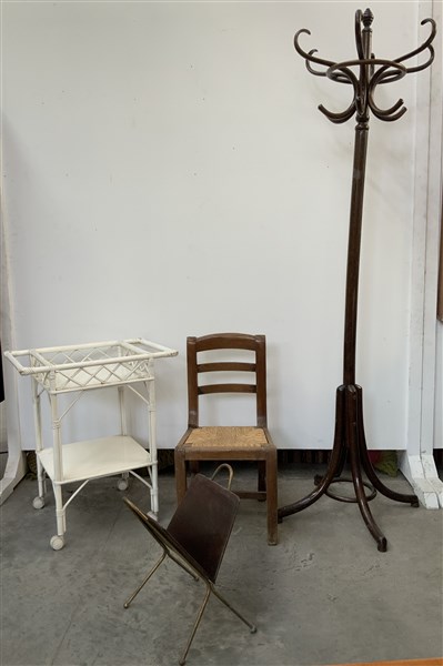 Lotto composto da un appendiabiti, un carrellino in giunco con rotelle, una sedia con sedile in paglia e un portariviste (difetti)