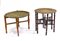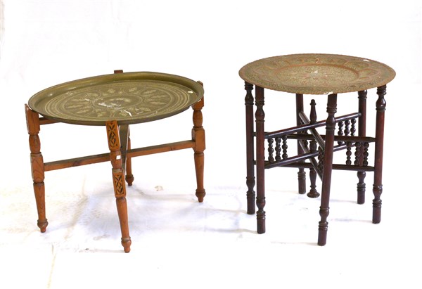 Lotto di due tavolini orientali con piani tondi asportabili in ottone inciso, gambe pieghevoli in legno (difetti e mancanze)
