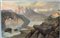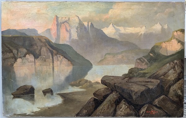 "Paesaggio lacustre montano" olio su tela (cm 57x90) firmato e datato 1905 in basso a destra (difetti)