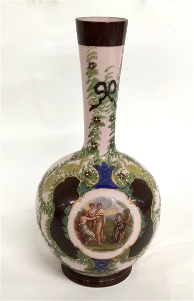 Vaso in vetro opalino a fondo rosa decorato a scena classica e ghirlande di foglie e fiori.