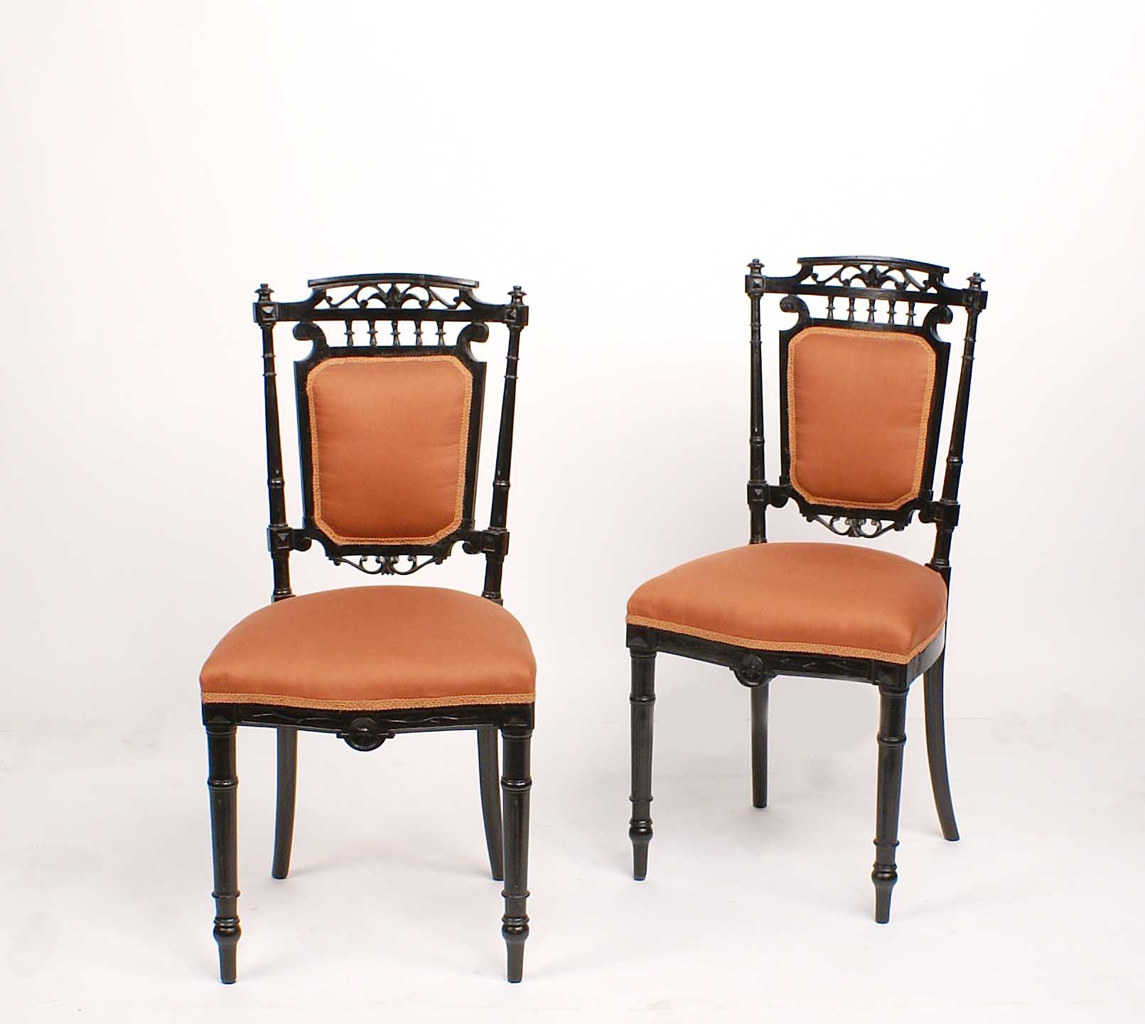 COPPIA DI SEDIE vecchia manifattura In legno ebanizzato ed intagliato con schienali e sedute in tessuto H. 87 cm.