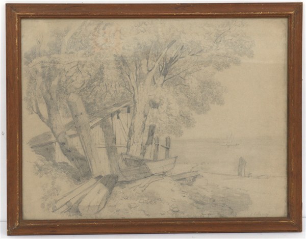 Alexandre Calame "Scorcio con barca" disegno a matita (cm 40x52) firmato in bas