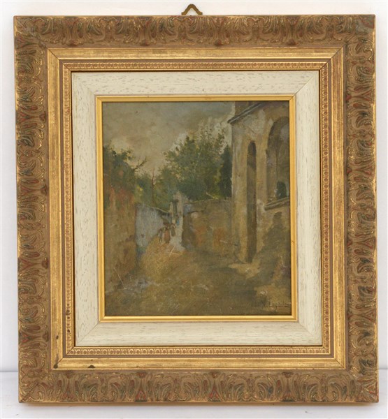 Vincenzo Caprile "Scorcio di paesi" olio su carta incollata su compensato (cm 22x19) firmato in basso a destra, in cornice (difetti)