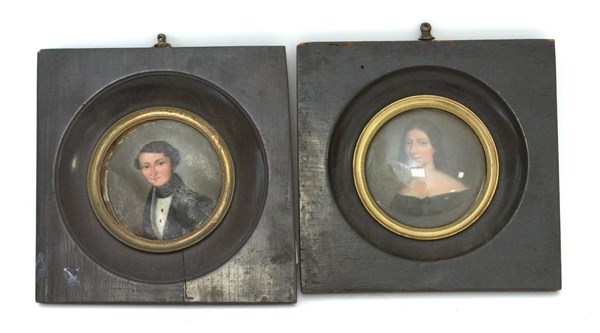 Lotto di due miniature tonde raffiguranti gentiluomo e gentildonna (d cm ) in cornice (difetti, restauri e mancanze)