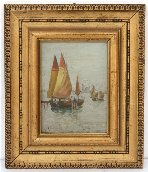Eugenio Bonivento "Marina con barche" olio su cartone pressato (cm 27x21) firmato in basso a sinistra, in cornice (difetti)