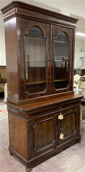 Libreria a due corpi lastronato in piuma e radica di noce, parte superiore a due ante a vetri, parte inferiore ad un cassetto e due ante riquadrate (cm 130x224x57) (difetti)