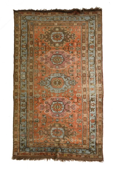 Decoro con cinque medaglioni nei toni dell'azzurro, lilla e camoscio su fondo albicocca (cm 231x134) (lievi difetti)
