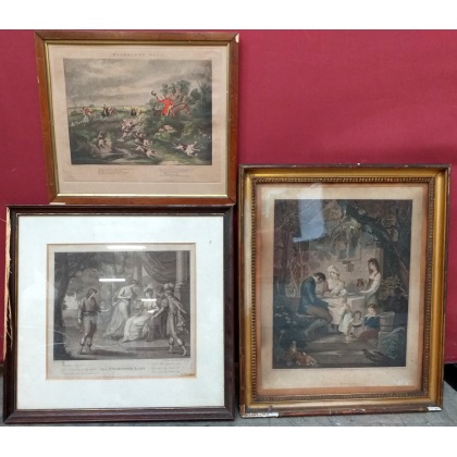 Lotto composto da tre incisioni inglesi raffiguranti scene di vita e scena di caccia, misure diverse, in cornici