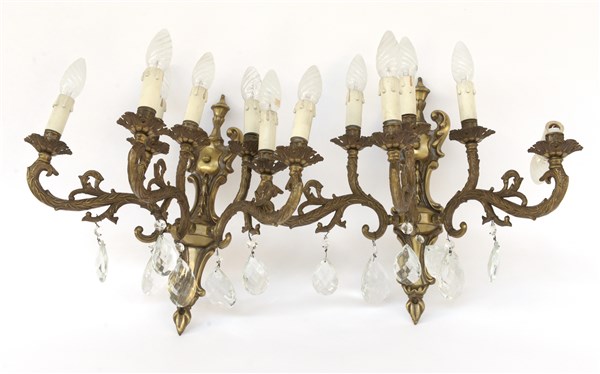 Lotto 2026 | Coppia di appliques a sei fiamme in metallo dorato, gocce in vetro (difetti)