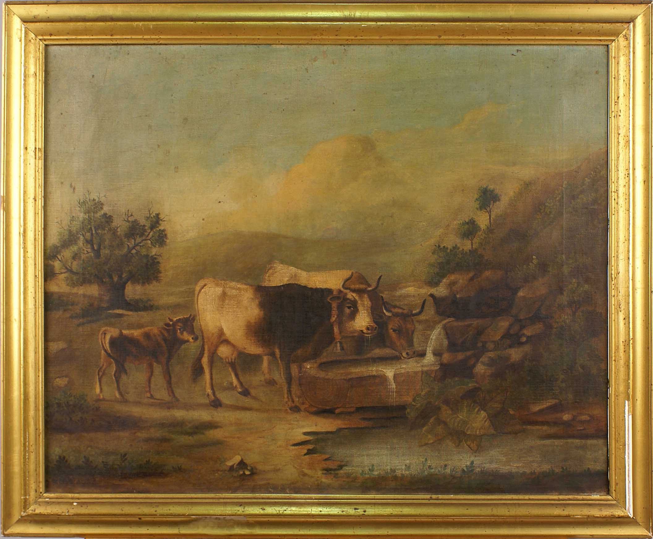 SCUOLA ITALIANA inizi del XX Sec. "Mucche all'abbeveratoio", olio su tela, entro cornice in legno dorato Dim. 44x55,5 cm.