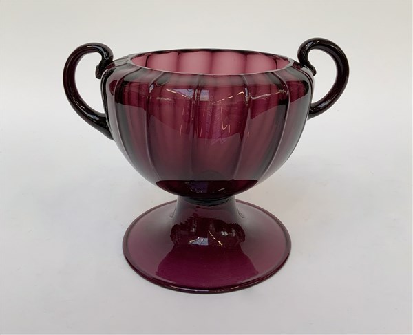 Manifattura di Murano, coppa biansata con corpo decorato a nervature in vetro soffiato color vinaccia (h cm 19) (lievi difetti)