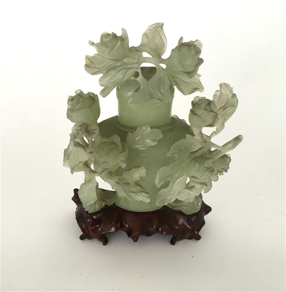 Lotto 2085 | Vaso scolpito con rami fiore in pietra dura di colore verde chiaro, base in leg