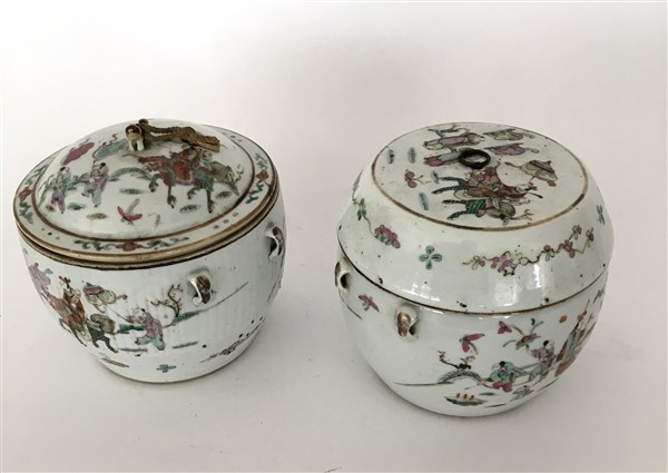 Coppia di contenitori per riso in porcellana policroma decorate a figure. Cina, secolo XX (difetti)