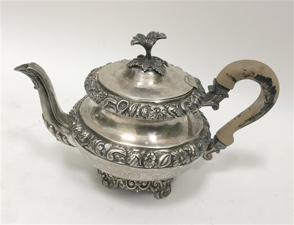 Caffettiera in argento con corpo inciso e parzialmente sbalzato a motivi di fiori e frutti. Coperchio con pomolo a fiore a tutto tondo. Manico in legno (h. cm 15,5) (g 400 ca.) Punzoni napoletani, secolo XIX (mancanze)