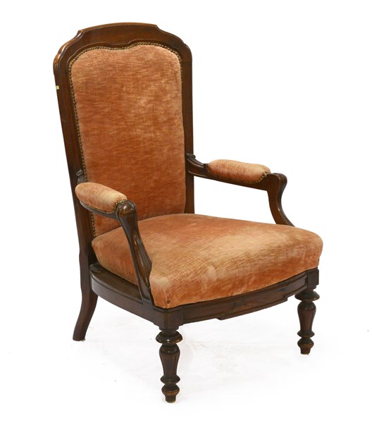 Poltrona in noce con schienale a scudo, montanti sagomati, piedi anteriori torniti, rivestita in velluto. Fine secolo XIX (difetti)